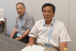 写真は全労連国際部の布施さん(左)、開会あいさつをする電機・情報ユニオンの森書記長。