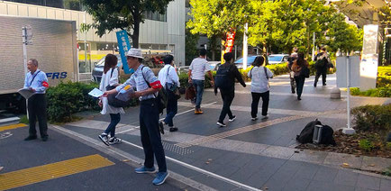 9月25日7時50分からパナソニック目黒拠点五反田でパナソニックは黒字リストラの撤回を求める、ビラを配布しました。